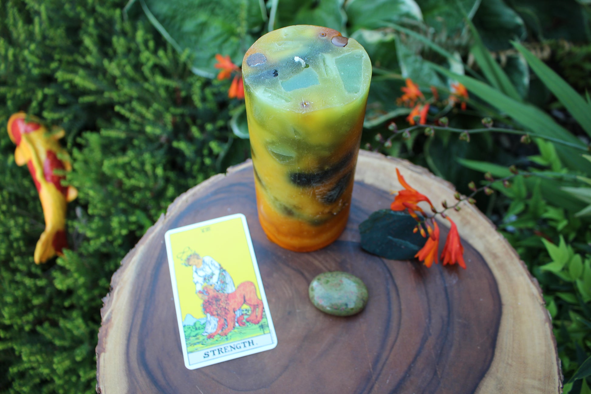 Strength embodies the balance of power and compassion, urging you to lead with courage and grace. Her luminous colors of gold, orange, blue, and green reflect the harmony of boldness and serenity, encouraging you to channel your inner resilience. The invigorating blend of petitgrain, sea salt, eucalyptus, and sandalwood fills your space with an aura of vitality and calm, providing the clarity and focus needed to face any challenge. She inspires you to approach life with patience and unwavering determination.